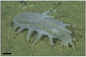 Members of the Elpidiidae have particularly enlarged tube "feet" that have taken on a leg-like appearance, using water cavities within the skin to inflate and deflate thereby causing the appendages to move. These appendages are different from the normal tube feet of the broader order of Elasipodida due the replacement of ampullae with dermal cavities to account for the larger size of the Elpidiidae tube feet. Scotoplanes move through the top layer of seafloor sediment and disrupt both the surface and the resident infauna as they feed. This type of movement is thought to be an adaptation to life on the soft floor of the deep sea. These creatures, however, can swim when disturbed. Some species of Scotoplanes are benthopelagic and spend plenty of time in the water column. A frontal lobe as well as two anal lobes propel the sea pig through the water. Their tentacles help detect their surroundings while moving.